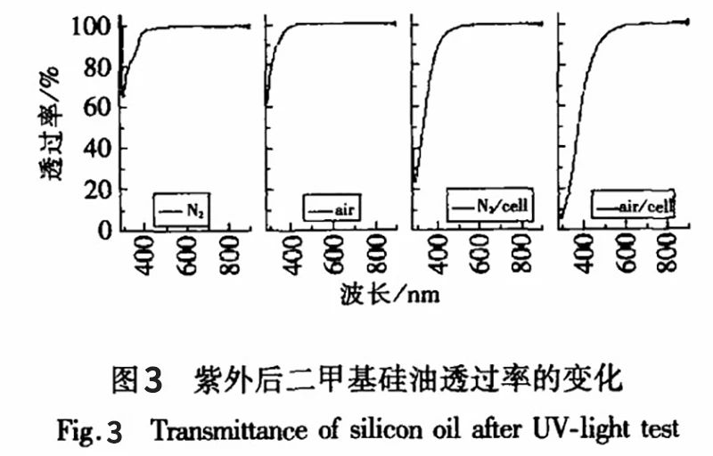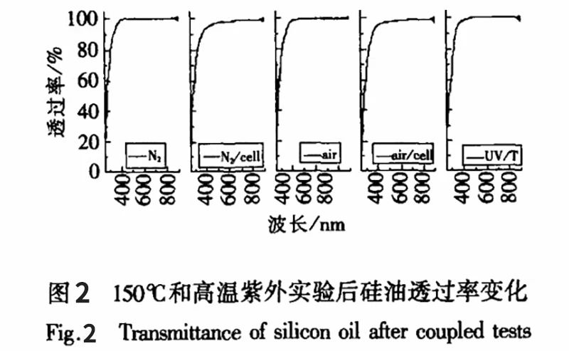 3)紫外照射时,硅油在无电池加入时,氧的存在对硅油的透过率几乎无影响,有电池时,氧的存在能够促进透过率的降低;无论有无氧存在,电池的存在能够很大程度地促进硅油在低波段光谱的降低,原因可能是高能量的紫外线光子激发了电池表面一些物质,溶入硅油引起了透过率的降低,且在有氧的存在下,这种作用更加强烈。耦合实验紫外照射时间(72h)比紫外实验(120h)短,而耦合实验后硅油透过率下降也比紫外实验要小。所以可知温度和紫外耦合对硅油性质变化没有明显作用。